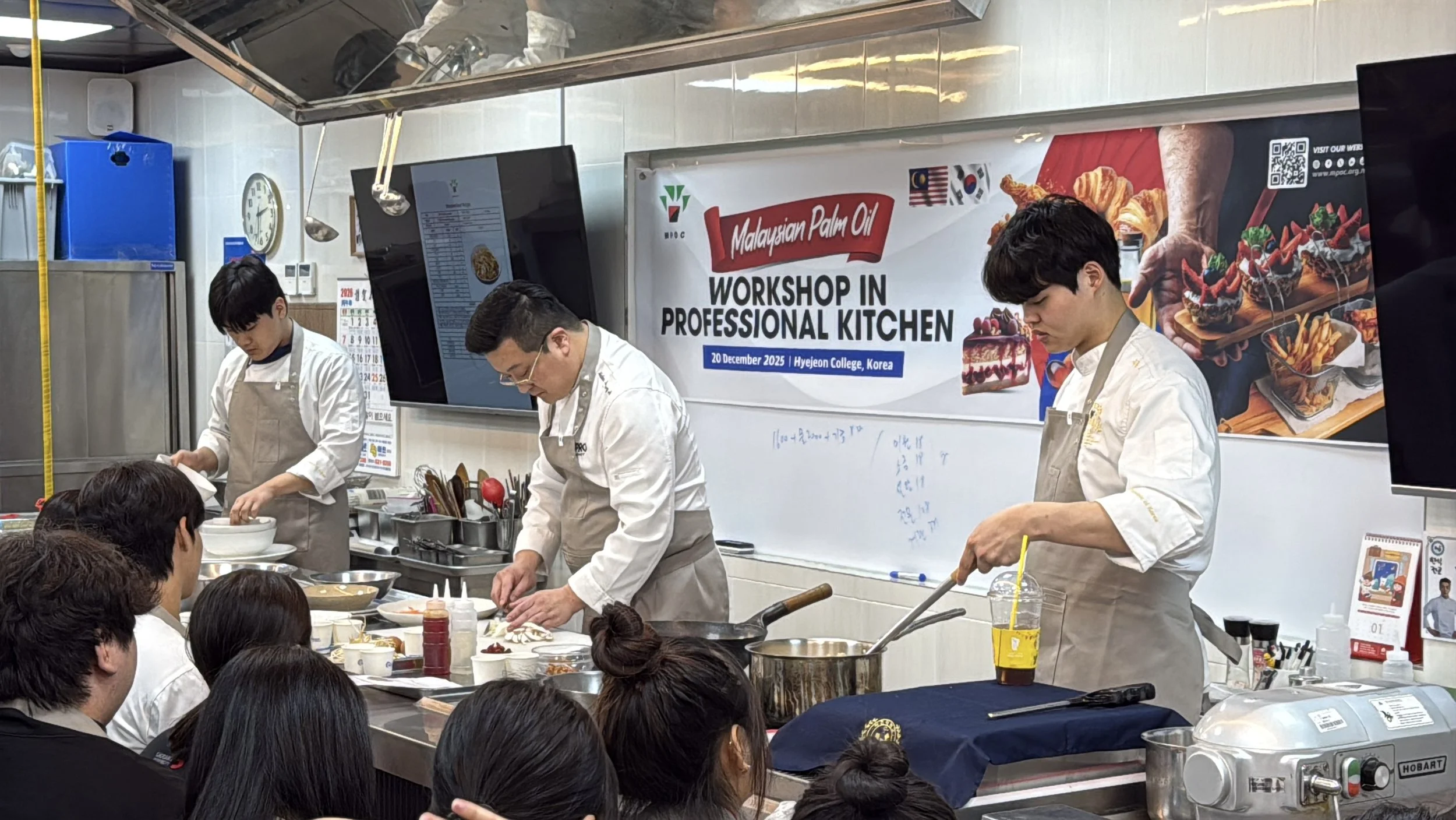 Held at Hyejeon College, South Korea, in collaboration with APRO Foodtainment, the programme highlighted the versatility and sustainability of Malaysian palm oil through live cooking demonstrations, presentations, and interactive sessions. The sessions were led by Professor Suk Hoo Yoon of Woosuk University and Chef Aiden Ahn.