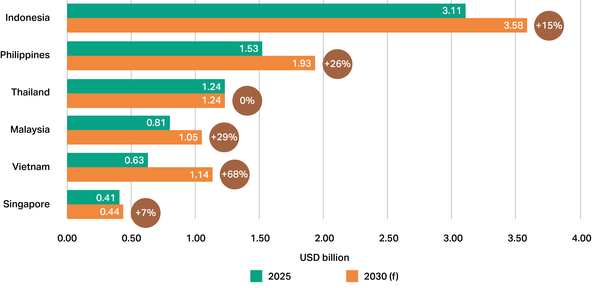 In growth terms, Vietnam is expected to be the fastest-expanding market over the next five years, with market size projected to increase by 68% between 2025 and 2030 (see Figure 3). Malaysia and the Philippines are forecast to grow by 29% and 26% respectively. By contrast, Indonesia and Singapore are expected to record more modest growth of 15% and 7%, while Thailand’s market is projected to remain broadly flat over the same period.