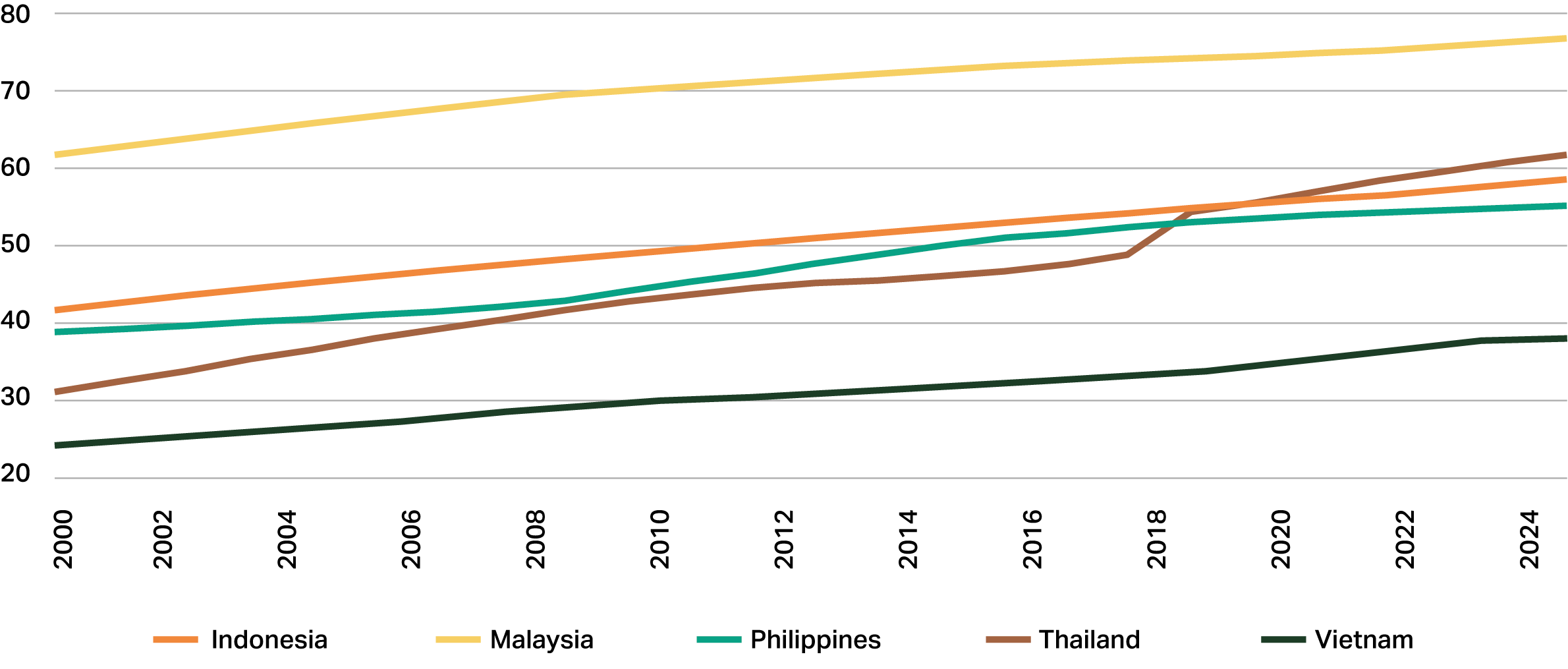 Figure 2: Percentage of urban population in major Southeast Asian countries (World Bank, 2025).