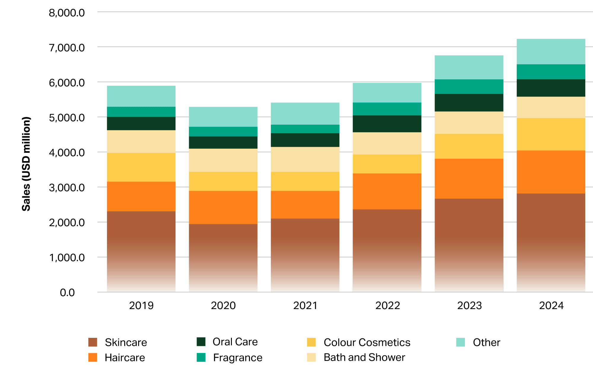 Figure 1: Sales of major categories in beauty and personal care sector, in USD million (Euromonitor, 2025).