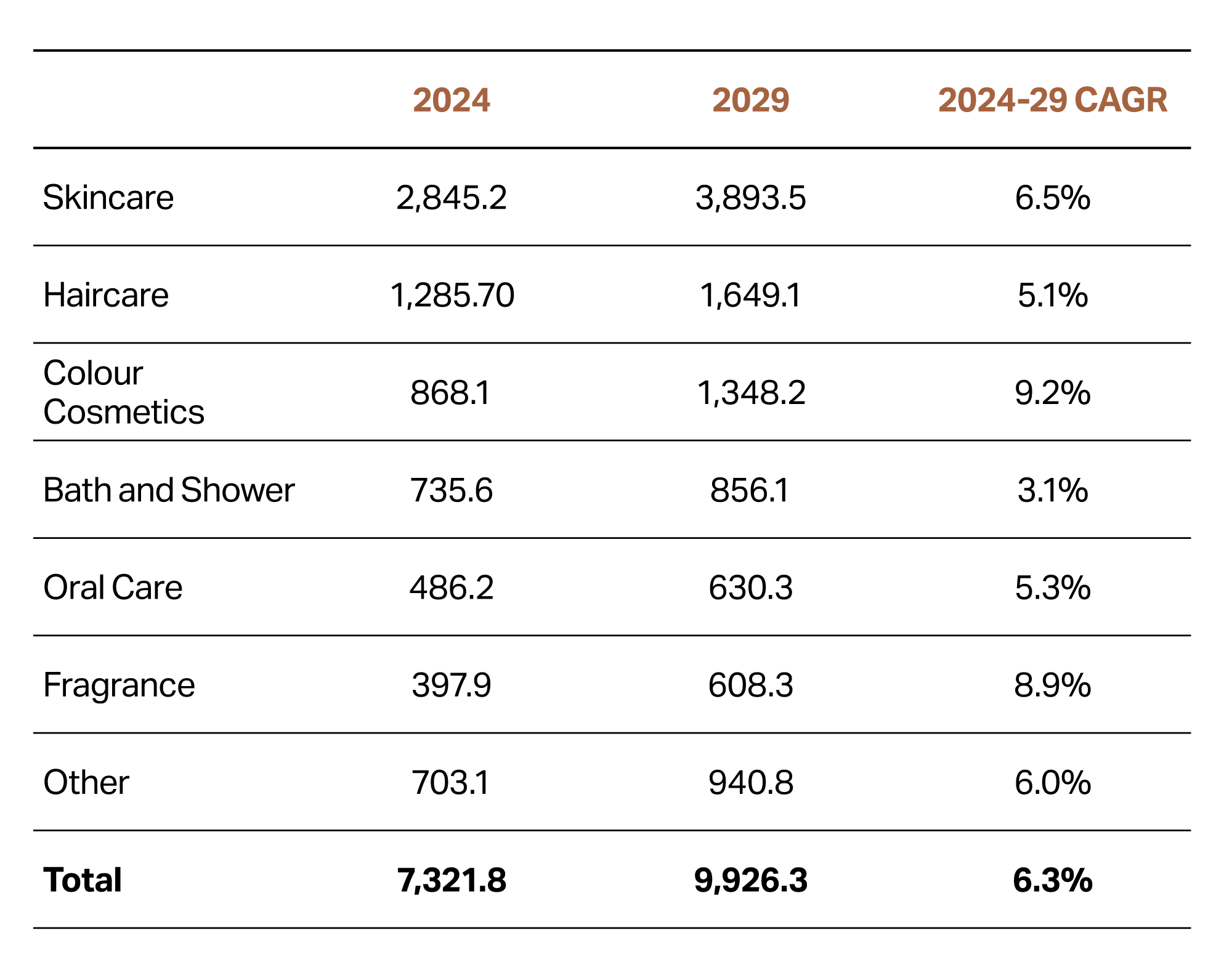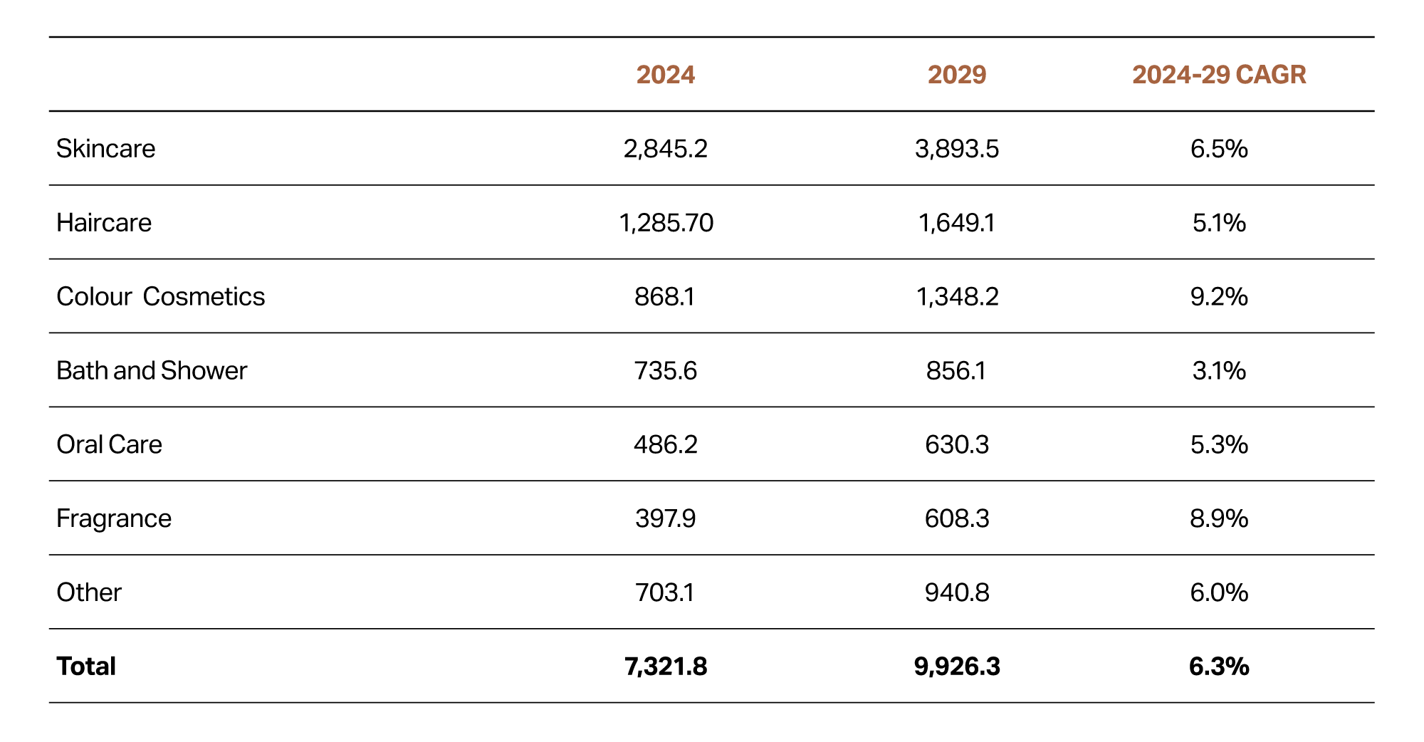 Table 2: Beauty and personal care products sales growth forecast, in USD million (Euromonitor, 2025).