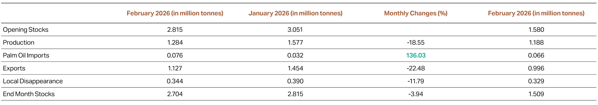 Table 1: Monthly statistics of Malaysian palm oil for February 2026 (MPOB, 2026).