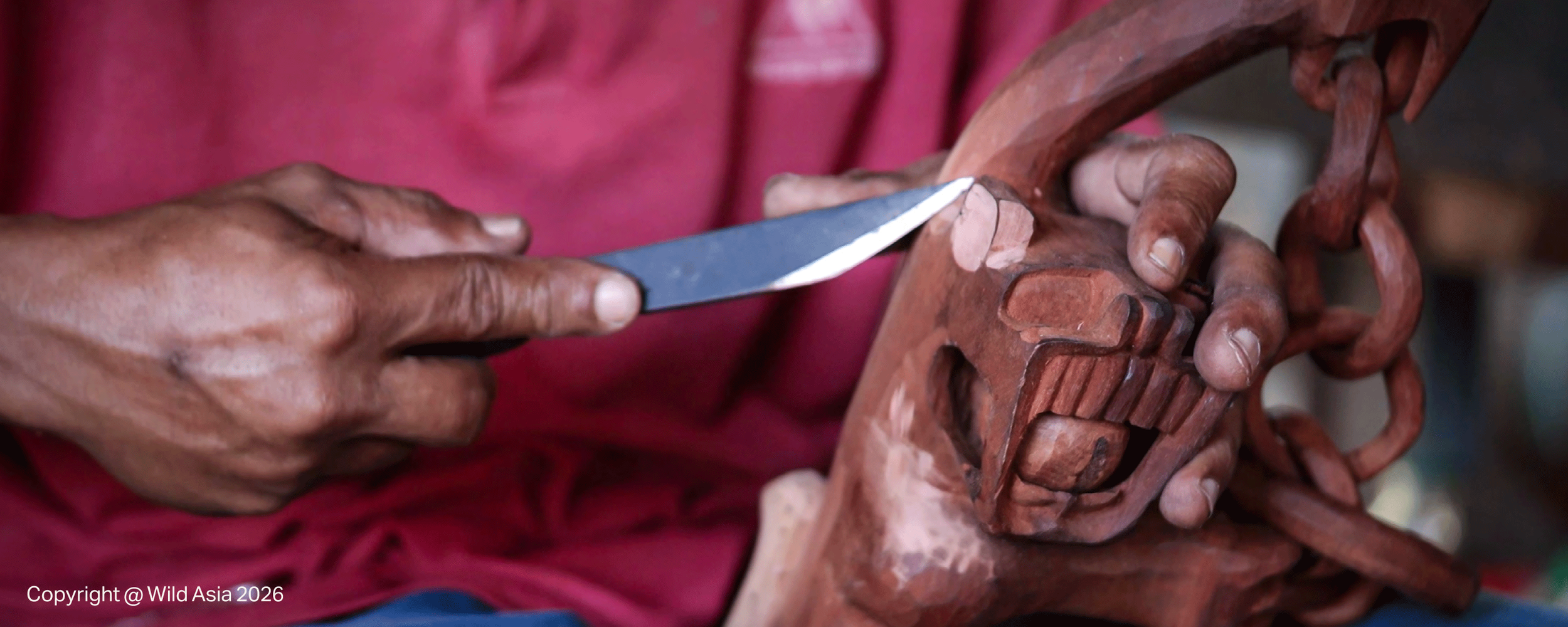 In his workshop at "Samri Kraf Pulau Carey," Samri shapes a tiger sculpture from a block of Nyireh Batu wood. Between carving sessions, he tends a three-acre oil palm farm—the same land his father first planted in the 1970s.